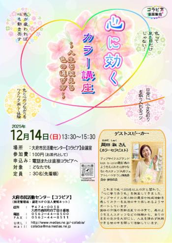 まちづくりの推進公開日:2025年11月14日心に効くカラー講座~人生を変える色の選び方~開催日:2025年12月14日(日)
