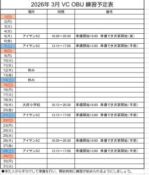 VC OBU/中・高生バレーボール 2024年1月の練習予定